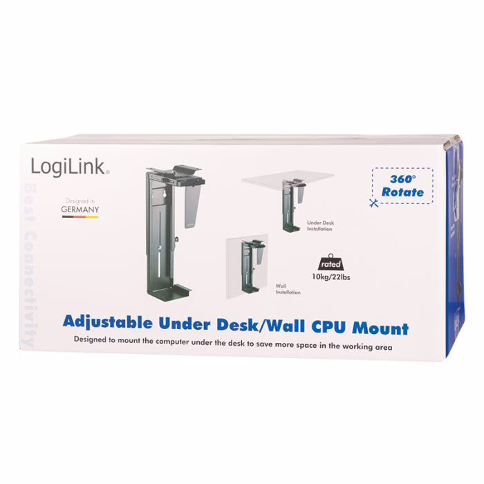 Η βάση υπολογιστή της LogiLink EO0005 ,σου παρέχει μια αξιόπιστη λύση για την τοποθέτηση και την προστασία της κεντρικής μονάδας του υπολογιστή σου.Σχεδιασμένη για να τοποθετείται κάτω από το γραφείο ή το τραπέζι, αυτή η βάση εξασφαλίζει την οργανωμένη τοποθέτηση της μονάδας CPU, ελευθερώνοντας παράλληλα τον χώρο από την επιφάνεια εργασίας σου.