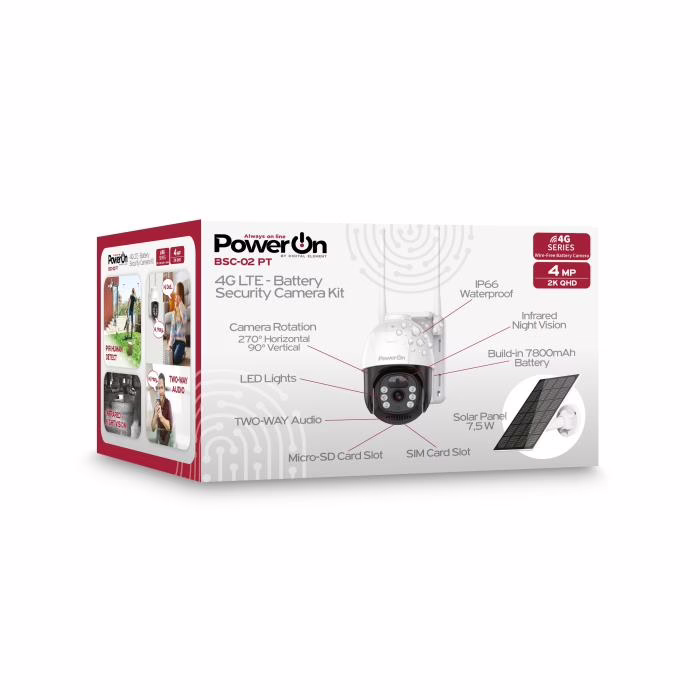 Η Power On BSC-02 IP Camera 4G είναι μια προηγμένη κάμερα ασφαλείας εξωτερικού χώρου, εξοπλισμένη με αισθητήρα CMOS 1/3.0″ 4MP και φακό 4mm, προσφέροντας καθαρή εικόνα με ανάλυση 2560×1440.